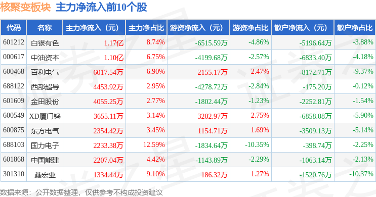 从资金流向上来看,当日核聚变板块主力资金净流出34.88亿元,游资资金净流入11.89亿元,散户资金净流入23.0亿元。核聚变板块个股资金流向见下表: