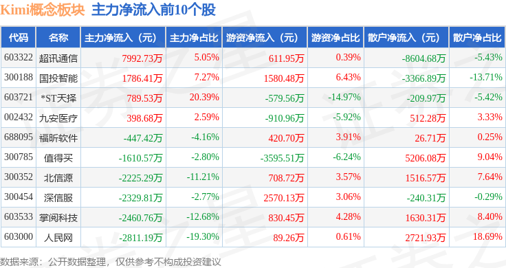 从资金流向上来看,当日Kimi概念板块主力资金净流出5.97亿元,游资资金净流入4.2亿元,散户资金净流入1.77亿元。Kimi概念板块个股资金流向见下表: