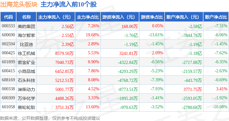 从资金流向上来看,当日出海龙头板块主力资金净流出99.54亿元,游资资金净流入27.59亿元,散户资金净流入71.95亿元。出海龙头板块个股资金流向见下表:
