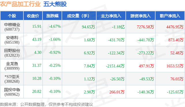 个股表现方面,农产品加工行业当日领跌股为中粮糖业(600737),该股当日报收15.91,下跌4.67%,成交量94.65万,主力资金净流出1.18亿元。安德利(605198)以下跌1.66%紧随其后,该股当日成交量1.68万,主力资金净流出431.7万元。除此之外,田野股份(832023)、金龙鱼(300999)、*ST佳沃(300268)均进入当日熊股之列。具体个股列表见下表: