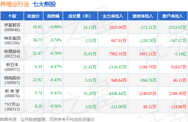 个股表现方面,养殖业行业当日领跌股为京基智农(000048),该股当日报收16.85,下跌0.88%,成交量24.13万,主力资金净流入2925.99万元。神农集团(605296)以下跌0.74%紧随其后,该股当日成交量2.55万,主力资金净流入667.91万元。除此之外,牧原股份(002714)、新五丰(600975)、晓鸣股份(300967)均进入当日熊股之列。具体个股列表见下表: