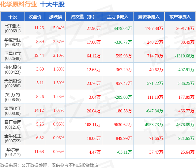 个股表现方面,化学原料行业当日领涨股为*ST亚太(000691),该股当日报收11.26,上涨5.04%,成交量27.9万,主力资金净流出4479.04万元。华谊集团(600623)以上涨2.57%紧随其后,该股当日成交量17.0万,主力资金净流出336.77万元。除此之外,卫星化学(002648)、柳化股份(600423)、天原股份(002386)均进入当日牛股之列。具体个股列表见下表: