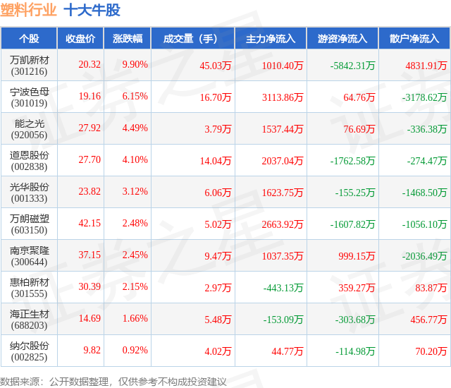 个股表现方面,塑料行业当日领涨股为万凯新材(301216),该股当日报收20.32,上涨9.9%,成交量45.03万,主力资金净流入1010.4万元。宁波色母(301019)以上涨6.15%紧随其后,该股当日成交量16.7万,主力资金净流入3113.86万元。除此之外,能之光(920056)、道恩股份(002838)、光华股份(001333)均进入当日牛股之列。具体个股列表见下表: