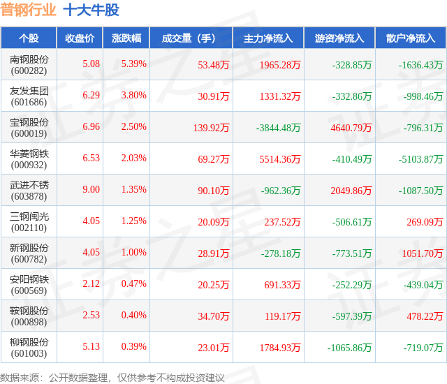 个股表现方面,普钢行业当日领涨股为南钢股份(600282),该股当日报收5.08,上涨5.39%,成交量53.48万,主力资金净流入1965.28万元。友发集团(601686)以上涨3.8%紧随其后,该股当日成交量30.91万,主力资金净流入1331.32万元。除此之外,宝钢股份(600019)、华菱钢铁(000932)、武进不锈(603878)均进入当日牛股之列。具体个股列表见下表: