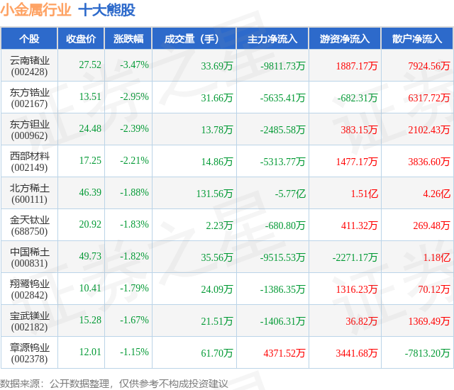 个股表现方面,小金属行业当日领跌股为云南锗业(002428),该股当日报收27.52,下跌3.47%,成交量33.69万,主力资金净流出9811.73万元。东方锆业(002167)以下跌2.95%紧随其后,该股当日成交量31.66万,主力资金净流出5635.41万元。除此之外,东方钽业(000962)、西部材料(002149)、北方稀土(600111)均进入当日熊股之列。具体个股列表见下表: