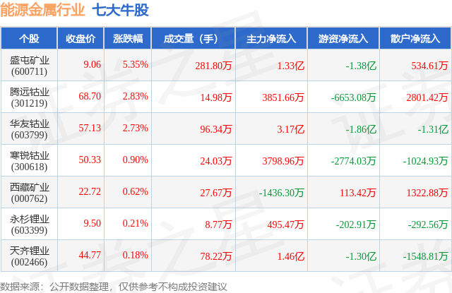 个股表现方面,能源金属行业当日领涨股为盛屯矿业(600711),该股当日报收9.06,上涨5.35%,成交量281.8万,主力资金净流入1.33亿元。腾远钴业(301219)以上涨2.83%紧随其后,该股当日成交量14.98万,主力资金净流入3851.66万元。除此之外,华友钴业(603799)、寒锐钴业(300618)、西藏矿业(000762)均进入当日牛股之列。具体个股列表见下表: