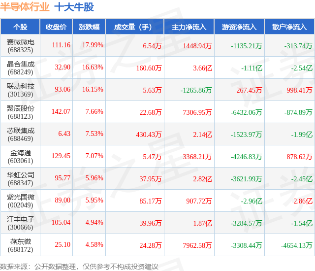 个股表现方面,半导体行业当日领涨股为赛微微电(688325),该股当日报收111.16,上涨17.99%,成交量6.54万,主力资金净流入1448.94万元。晶合集成(688249)以上涨16.63%紧随其后,该股当日成交量160.6万,主力资金净流入3.66亿元。除此之外,联动科技(301369)、聚辰股份(688123)、芯联集成(688469)均进入当日牛股之列。具体个股列表见下表: