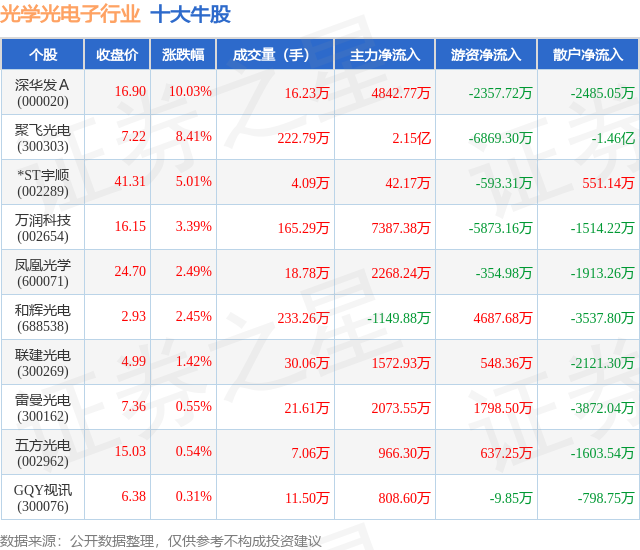 个股表现方面,光学光电子行业当日领涨股为深华发A(000020),该股当日报收16.9,上涨10.03%,成交量16.23万,主力资金净流入4842.77万元。聚飞光电(300303)以上涨8.41%紧随其后,该股当日成交量222.79万,主力资金净流入2.15亿元。除此之外,*ST宇顺(002289)、万润科技(002654)、凤凰光学(600071)均进入当日牛股之列。具体个股列表见下表: