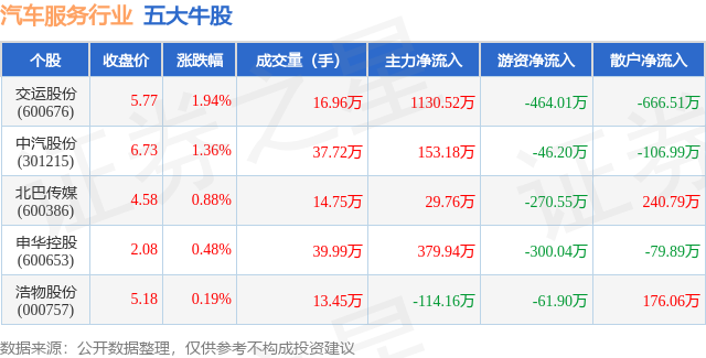 个股表现方面,汽车服务行业当日领涨股为交运股份(600676),该股当日报收5.77,上涨1.94%,成交量16.96万,主力资金净流入1130.52万元。中汽股份(301215)以上涨1.36%紧随其后,该股当日成交量37.72万,主力资金净流入153.18万元。除此之外,北巴传媒(600386)、申华控股(600653)、浩物股份(000757)均进入当日牛股之列。具体个股列表见下表: