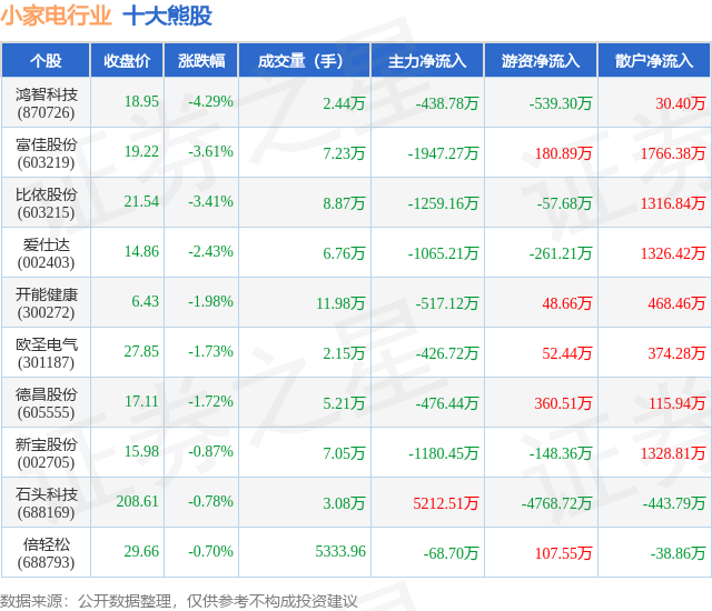 个股表现方面,小家电行业当日领跌股为鸿智科技(870726),该股当日报收18.95,下跌4.29%,成交量2.44万,主力资金净流出438.78万元。富佳股份(603219)以下跌3.61%紧随其后,该股当日成交量7.23万,主力资金净流出1947.27万元。除此之外,比依股份(603215)、爱仕达(002403)、开能健康(300272)均进入当日熊股之列。具体个股列表见下表: