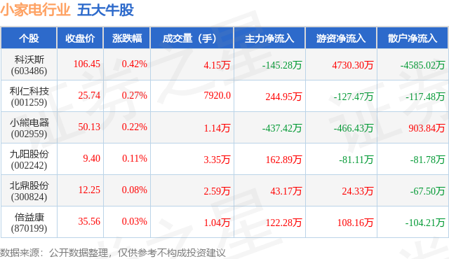个股表现方面,小家电行业当日领涨股为科沃斯(603486),该股当日报收106.45,上涨0.42%,成交量4.15万,主力资金净流出145.28万元。利仁科技(001259)以上涨0.27%紧随其后,该股当日成交量7920.0,主力资金净流入244.95万元。除此之外,小熊电器(002959)、九阳股份(002242)、北鼎股份(300824)均进入当日牛股之列。具体个股列表见下表: