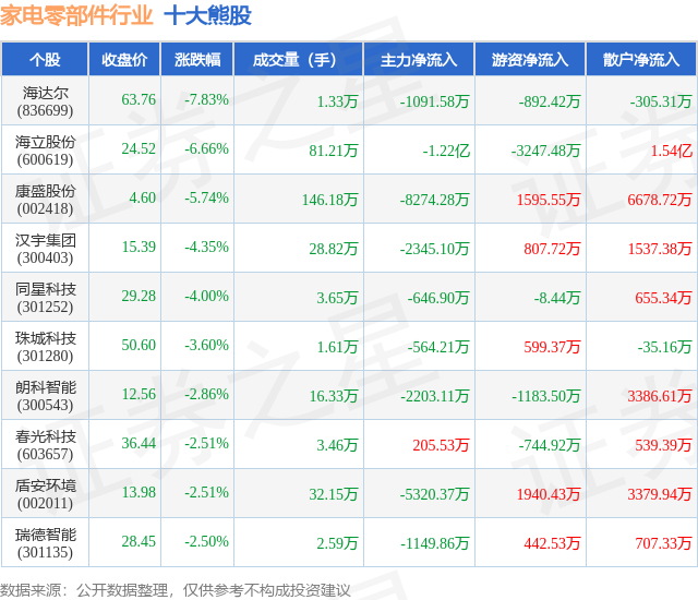 个股表现方面,家电零部件行业当日领跌股为海达尔(836699),该股当日报收63.76,下跌7.83%,成交量1.33万,主力资金净流出1091.58万元。海立股份(600619)以下跌6.66%紧随其后,该股当日成交量81.21万,主力资金净流出1.22亿元。除此之外,康盛股份(002418)、汉宇集团(300403)、同星科技(301252)均进入当日熊股之列。具体个股列表见下表: