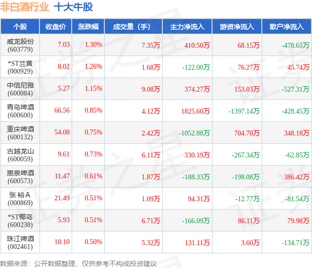 个股表现方面,非白酒行业当日领涨股为威龙股份(603779),该股当日报收7.03,上涨1.3%,成交量7.35万,主力资金净流入410.5万元。*ST兰黄(000929)以上涨1.26%紧随其后,该股当日成交量1.68万,主力资金净流出122.0万元。除此之外,中信尼雅(600084)、青岛啤酒(600600)、重庆啤酒(600132)均进入当日牛股之列。具体个股列表见下表: