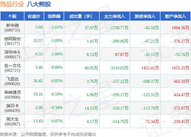 个股表现方面,饰品行业当日领跌股为新华锦(600735),该股当日报收5.6,下跌2.61%,成交量37.97万,主力资金净流出1758.77万元。迪阿股份(301177)以下跌1.09%紧随其后,该股当日成交量1.41万,主力资金净流出309.06万元。除此之外,深中华A(000017)、金一文化(002721)、飞亚达(000026)均进入当日熊股之列。具体个股列表见下表: