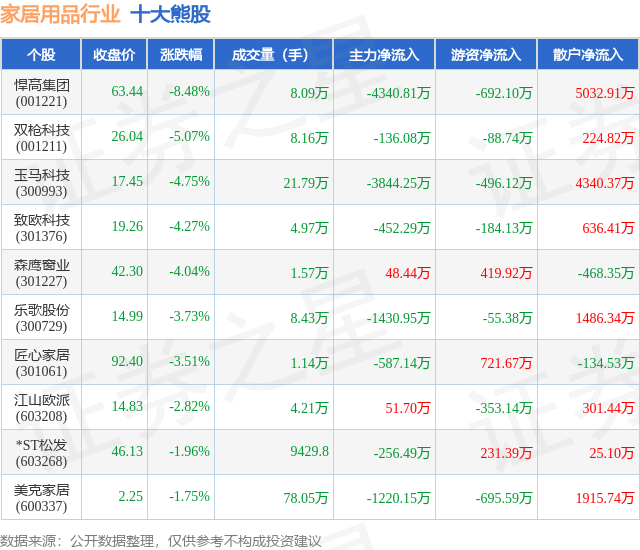 个股表现方面,家居用品行业当日领跌股为悍高集团(001221),该股当日报收63.44,下跌8.48%,成交量8.09万,主力资金净流出4340.81万元。双枪科技(001211)以下跌5.07%紧随其后,该股当日成交量8.16万,主力资金净流出136.08万元。除此之外,玉马科技(300993)、致欧科技(301376)、森鹰窗业(301227)均进入当日熊股之列。具体个股列表见下表: