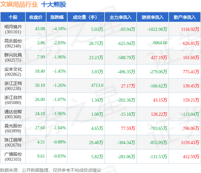 个股表现方面,文娱用品行业当日领跌股为明月镜片(301101),该股当日报收43.08,下跌4.18%,成交量5.03万,主力资金净流出93.94万元。高乐股份(002348)以下跌2.03%紧随其后,该股当日成交量28.75万,主力资金净流出625.94万元。除此之外,群兴玩具(002575)、实丰文化(002862)、浙江正特(001238)均进入当日熊股之列。具体个股列表见下表: