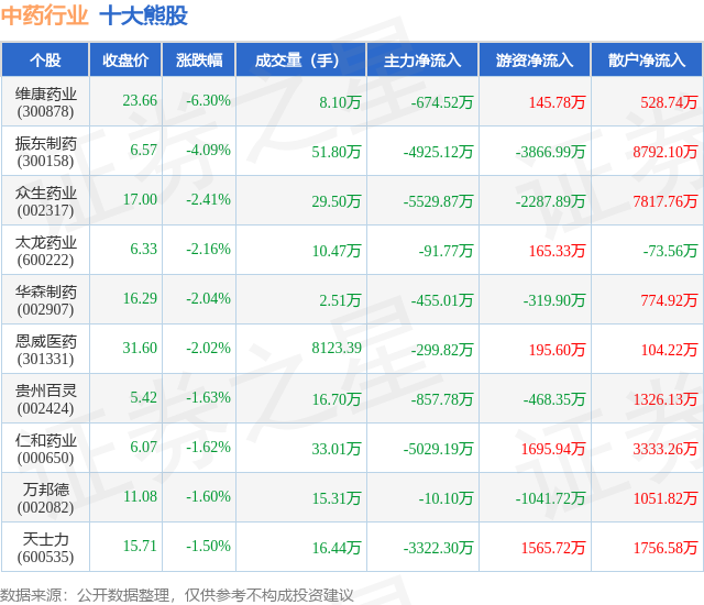 个股表现方面,中药行业当日领跌股为维康药业(300878),该股当日报收23.66,下跌6.3%,成交量8.1万,主力资金净流出674.52万元。振东制药(300158)以下跌4.09%紧随其后,该股当日成交量51.8万,主力资金净流出4925.12万元。除此之外,众生药业(002317)、太龙药业(600222)、华森制药(002907)均进入当日熊股之列。具体个股列表见下表: