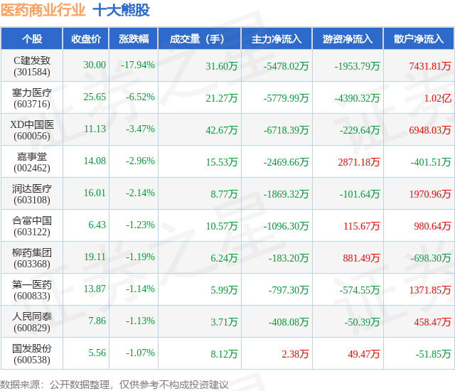 个股表现方面,医药商业行业当日领跌股为C建发致(301584),该股当日报收30.0,下跌17.94%,成交量31.6万,主力资金净流出5478.02万元。塞力医疗(603716)以下跌6.52%紧随其后,该股当日成交量21.27万,主力资金净流出5779.99万元。除此之外,XD中国医(600056)、嘉事堂(002462)、润达医疗(603108)均进入当日熊股之列。具体个股列表见下表: