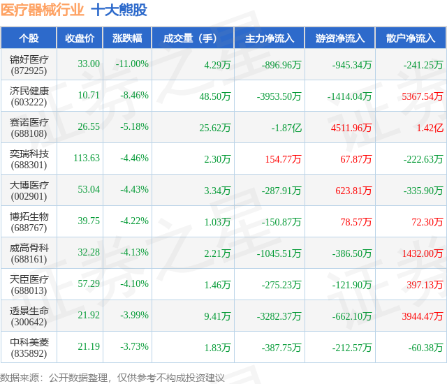 个股表现方面,医疗器械行业当日领跌股为锦好医疗(872925),该股当日报收33.0,下跌11.0%,成交量4.29万,主力资金净流出896.96万元。济民健康(603222)以下跌8.46%紧随其后,该股当日成交量48.5万,主力资金净流出3953.5万元。除此之外,赛诺医疗(688108)、奕瑞科技(688301)、大博医疗(002901)均进入当日熊股之列。具体个股列表见下表: