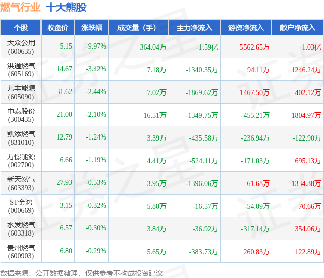 个股表现方面,燃气行业当日领跌股为大众公用(600635),该股当日报收5.15,下跌9.97%,成交量364.04万,主力资金净流出1.59亿元。洪通燃气(605169)以下跌3.42%紧随其后,该股当日成交量7.18万,主力资金净流出1340.35万元。除此之外,九丰能源(605090)、中泰股份(300435)、凯添燃气(831010)均进入当日熊股之列。具体个股列表见下表: