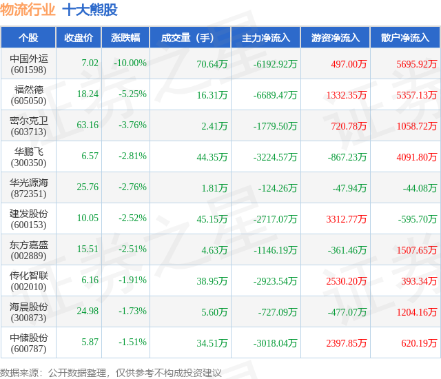 个股表现方面,物流行业当日领跌股为中国外运(601598),该股当日报收7.02,下跌10.0%,成交量70.64万,主力资金净流出6192.92万元。福然德(605050)以下跌5.25%紧随其后,该股当日成交量16.31万,主力资金净流出6689.47万元。除此之外,密尔克卫(603713)、华鹏飞(300350)、华光源海(872351)均进入当日熊股之列。具体个股列表见下表: