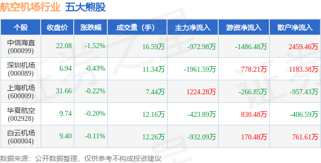 个股表现方面,航空机场行业当日领跌股为中信海直(000099),该股当日报收22.08,下跌1.52%,成交量16.59万,主力资金净流出972.98万元。深圳机场(000089)以下跌0.43%紧随其后,该股当日成交量11.34万,主力资金净流出1961.59万元。除此之外,上海机场(600009)、华夏航空(002928)、白云机场(600004)均进入当日熊股之列。具体个股列表见下表: