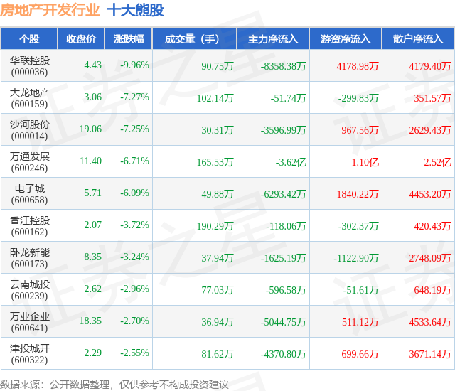 个股表现方面,房地产开发行业当日领跌股为华联控股(000036),该股当日报收4.43,下跌9.96%,成交量90.75万,主力资金净流出8358.38万元。大龙地产(600159)以下跌7.27%紧随其后,该股当日成交量102.14万,主力资金净流出51.74万元。除此之外,沙河股份(000014)、万通发展(600246)、电子城(600658)均进入当日熊股之列。具体个股列表见下表: