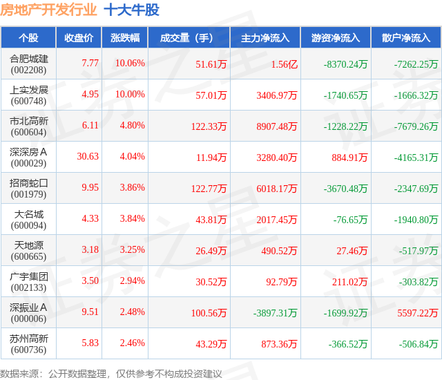 个股表现方面,房地产开发行业当日领涨股为合肥城建(002208),该股当日报收7.77,上涨10.06%,成交量51.61万,主力资金净流入1.56亿元。上实发展(600748)以上涨10.0%紧随其后,该股当日成交量57.01万,主力资金净流入3406.97万元。除此之外,市北高新(600604)、深深房A(000029)、招商蛇口(001979)均进入当日牛股之列。具体个股列表见下表: