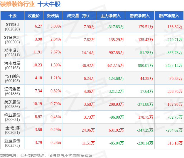 个股表现方面,装修装饰行业当日领涨股为ST瑞和(002620),该股当日报收6.27,上涨5.03%,成交量7.9万,主力资金净流出317.83万元。ST名家汇(300506)以上涨2.84%紧随其后,该股当日成交量7.62万,主力资金净流入135.29万元。除此之外,郑中设计(002811)、海南发展(002163)、*ST创兴(600193)均进入当日牛股之列。具体个股列表见下表: