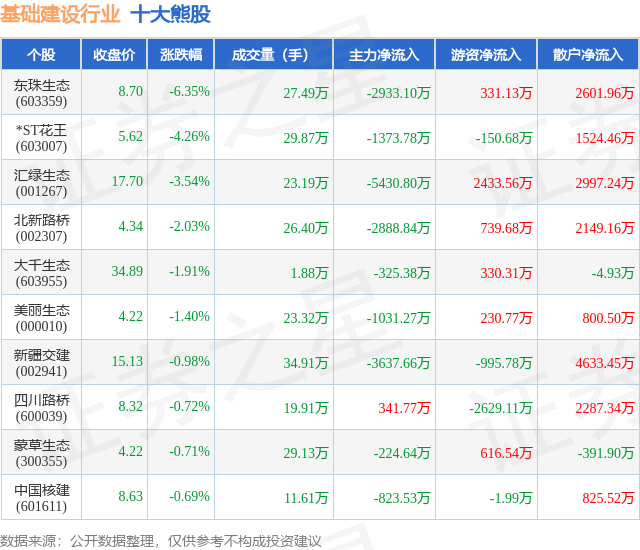 个股表现方面,基础建设行业当日领跌股为东珠生态(603359),该股当日报收8.7,下跌6.35%,成交量27.49万,主力资金净流出2933.1万元。*ST花王(603007)以下跌4.26%紧随其后,该股当日成交量29.87万,主力资金净流出1373.78万元。除此之外,汇绿生态(001267)、北新路桥(002307)、大千生态(603955)均进入当日熊股之列。具体个股列表见下表: