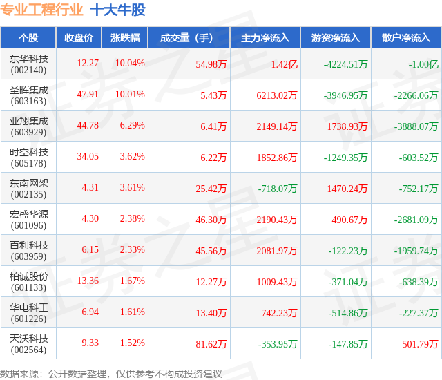 个股表现方面,专业工程行业当日领涨股为东华科技(002140),该股当日报收12.27,上涨10.04%,成交量54.98万,主力资金净流入1.42亿元。圣晖集成(603163)以上涨10.01%紧随其后,该股当日成交量5.43万,主力资金净流入6213.02万元。除此之外,亚翔集成(603929)、时空科技(605178)、东南网架(002135)均进入当日牛股之列。具体个股列表见下表: