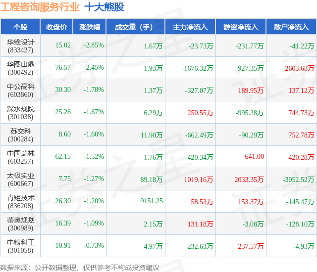 个股表现方面,工程咨询服务行业当日领跌股为华维设计(833427),该股当日报收15.02,下跌2.85%,成交量1.67万,主力资金净流出23.73万元。华图山鼎(300492)以下跌2.45%紧随其后,该股当日成交量1.93万,主力资金净流出1676.32万元。除此之外,中公高科(603860)、深水规院(301038)、苏交科(300284)均进入当日熊股之列。具体个股列表见下表: