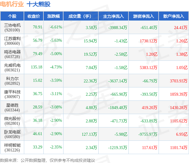 个股表现方面,电机行业当日领跌股为三协电机(920100),该股当日报收70.91,下跌6.61%,成交量3.58万,主力资金净流出3988.34万元。江苏雷利(300660)以下跌5.63%紧随其后,该股当日成交量15.94万,主力资金净流出1.43亿元。除此之外,鸣志电器(603728)、兆威机电(003021)、科力尔(002892)均进入当日熊股之列。具体个股列表见下表: