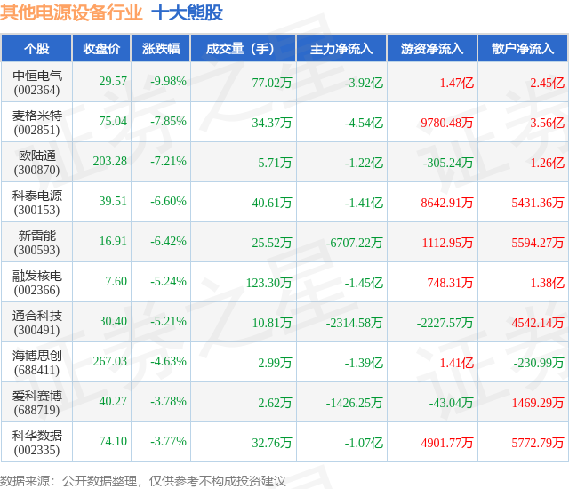 个股表现方面,其他电源设备行业当日领跌股为中恒电气(002364),该股当日报收29.57,下跌9.98%,成交量77.02万,主力资金净流出3.92亿元。麦格米特(002851)以下跌7.85%紧随其后,该股当日成交量34.37万,主力资金净流出4.54亿元。除此之外,欧陆通(300870)、科泰电源(300153)、新雷能(300593)均进入当日熊股之列。具体个股列表见下表: