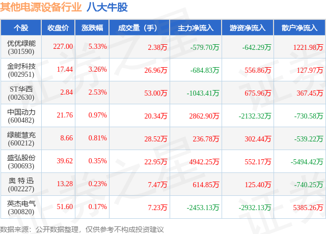 个股表现方面,其他电源设备行业当日领涨股为优优绿能(301590),该股当日报收227.0,上涨5.33%,成交量2.38万,主力资金净流出579.7万元。金时科技(002951)以上涨3.26%紧随其后,该股当日成交量26.96万,主力资金净流出684.83万元。除此之外,ST华西(002630)、中国动力(600482)、绿能慧充(600212)均进入当日牛股之列。具体个股列表见下表: