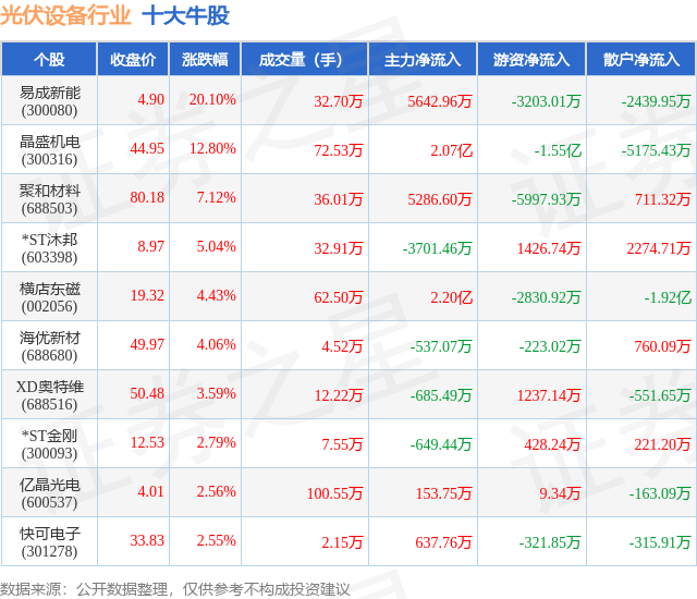 个股表现方面,光伏设备行业当日领涨股为易成新能(300080),该股当日报收4.9,上涨20.1%,成交量32.7万,主力资金净流入5642.96万元。晶盛机电(300316)以上涨12.8%紧随其后,该股当日成交量72.53万,主力资金净流入2.07亿元。除此之外,聚和材料(688503)、*ST沐邦(603398)、横店东磁(002056)均进入当日牛股之列。具体个股列表见下表: