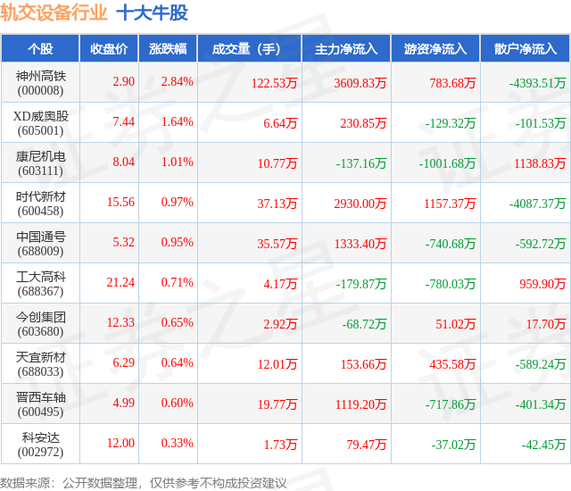个股表现方面,轨交设备行业当日领涨股为神州高铁(000008),该股当日报收2.9,上涨2.84%,成交量122.53万,主力资金净流入3609.83万元。XD威奥股(605001)以上涨1.64%紧随其后,该股当日成交量6.64万,主力资金净流入230.85万元。除此之外,康尼机电(603111)、时代新材(600458)、中国通号(688009)均进入当日牛股之列。具体个股列表见下表: