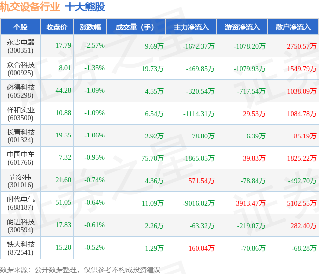 个股表现方面,轨交设备行业当日领跌股为永贵电器(300351),该股当日报收17.79,下跌2.57%,成交量9.69万,主力资金净流出1672.37万元。众合科技(000925)以下跌1.35%紧随其后,该股当日成交量19.73万,主力资金净流出469.85万元。除此之外,必得科技(605298)、祥和实业(603500)、长青科技(001324)均进入当日熊股之列。具体个股列表见下表: