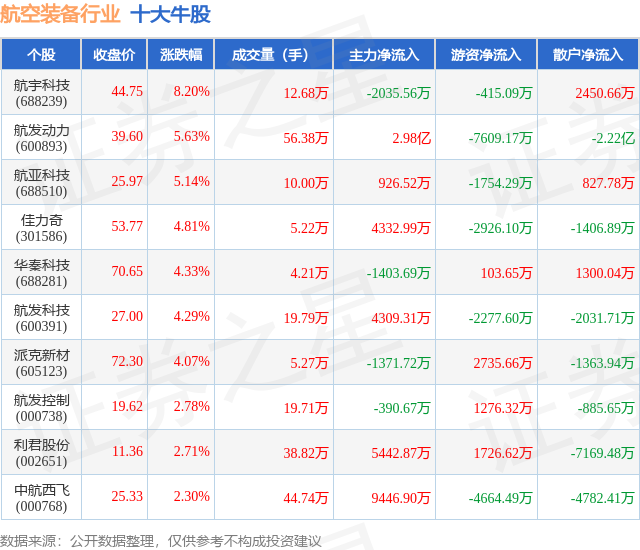 个股表现方面,航空装备行业当日领涨股为航宇科技(688239),该股当日报收44.75,上涨8.2%,成交量12.68万,主力资金净流出2035.56万元。航发动力(600893)以上涨5.63%紧随其后,该股当日成交量56.38万,主力资金净流入2.98亿元。除此之外,航亚科技(688510)、佳力奇(301586)、华秦科技(688281)均进入当日牛股之列。具体个股列表见下表: