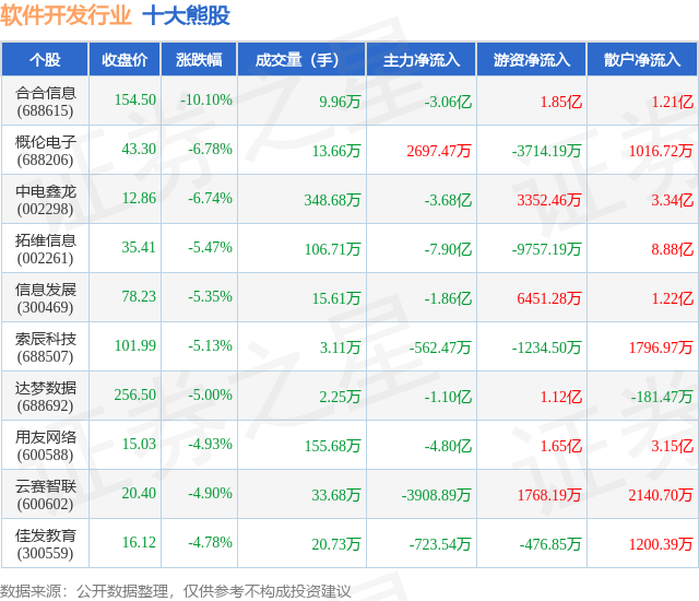 个股表现方面,软件开发行业当日领跌股为合合信息(688615),该股当日报收154.5,下跌10.1%,成交量9.96万,主力资金净流出3.06亿元。概伦电子(688206)以下跌6.78%紧随其后,该股当日成交量13.66万,主力资金净流入2697.47万元。除此之外,中电鑫龙(002298)、拓维信息(002261)、信息发展(300469)均进入当日熊股之列。具体个股列表见下表: