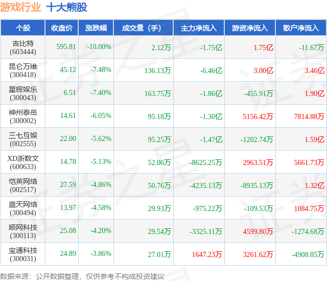 个股表现方面,游戏行业当日领跌股为吉比特(603444),该股当日报收595.81,下跌10.0%,成交量2.12万,主力资金净流出1.75亿元。昆仑万维(300418)以下跌7.48%紧随其后,该股当日成交量136.13万,主力资金净流出6.46亿元。除此之外,星辉娱乐(300043)、神州泰岳(300002)、三七互娱(002555)均进入当日熊股之列。具体个股列表见下表: