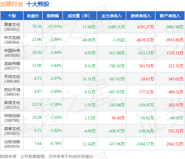 个股表现方面,出版行业当日领跌股为果麦文化(301052),该股当日报收79.1,下跌13.91%,成交量17.96万,主力资金净流出1109.31万元。中文在线(300364)以下跌2.8%紧随其后,该股当日成交量48.09万,主力资金净流出1.05亿元。除此之外,中国科传(601858)、龙版传媒(605577)、天舟文化(300148)均进入当日熊股之列。具体个股列表见下表: