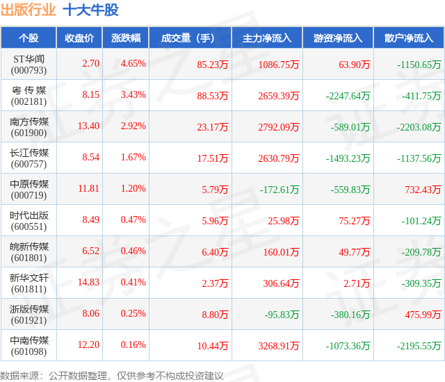 个股表现方面,出版行业当日领涨股为ST华闻(000793),该股当日报收2.7,上涨4.65%,成交量85.23万,主力资金净流入1086.75万元。粤 传 媒(002181)以上涨3.43%紧随其后,该股当日成交量88.53万,主力资金净流入2659.39万元。除此之外,南方传媒(601900)、长江传媒(600757)、中原传媒(000719)均进入当日牛股之列。具体个股列表见下表: