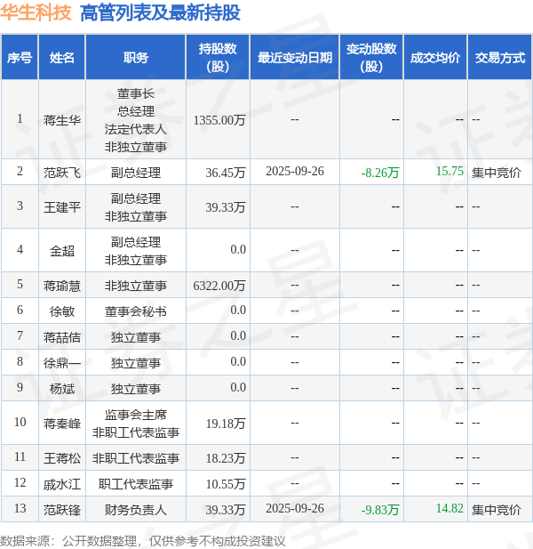 华生科技近半年内的董监高及核心技术人员增减持详情如下: