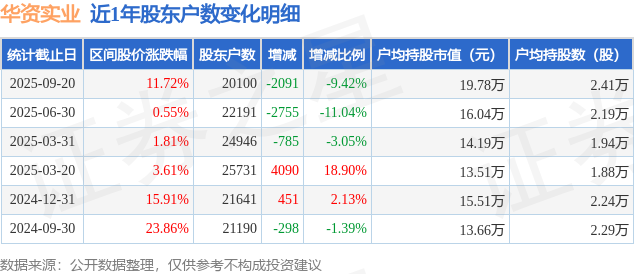 从股价来看,2025年6月30日至2025年9月20日,华资实业区间涨幅为11.72%,在此期间股东户数减少2091.0户,减幅为9.42%。