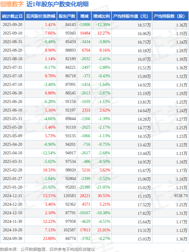 从股价来看,2025年9月10日至2025年9月20日,创维数字区间涨幅为1.41%,在此期间股东户数减少1.18万户,减幅为12.3%。