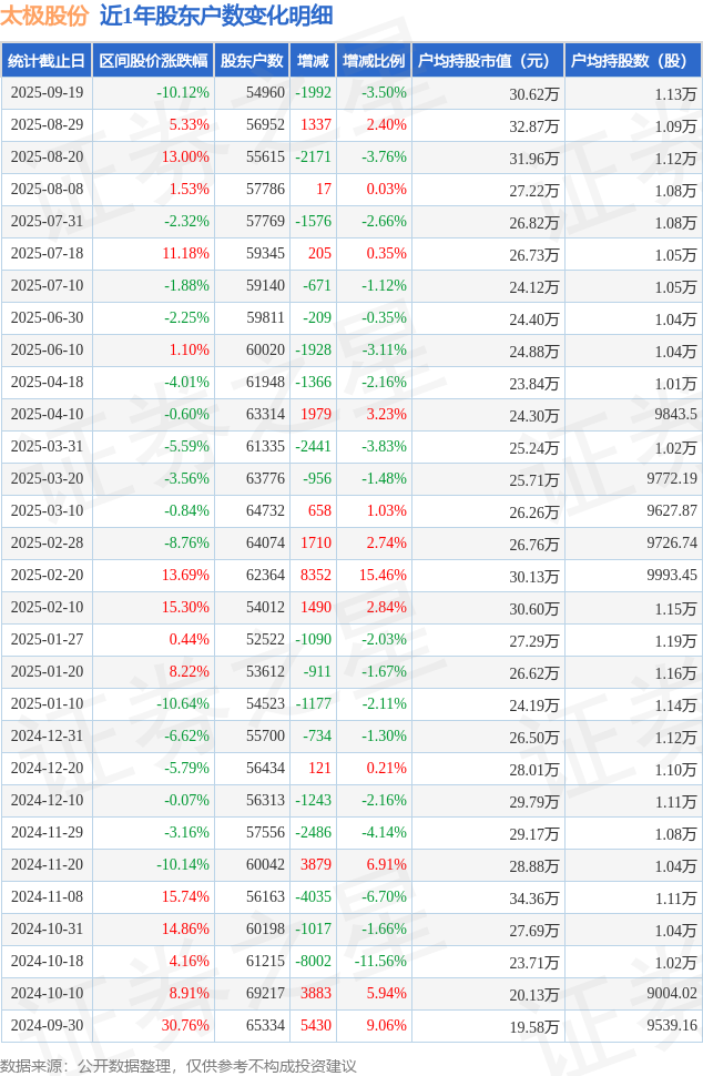 从股价来看,2025年8月29日至2025年9月19日,太极股份区间跌幅为10.12%,在此期间股东户数减少1992.0户,减幅为3.5%。