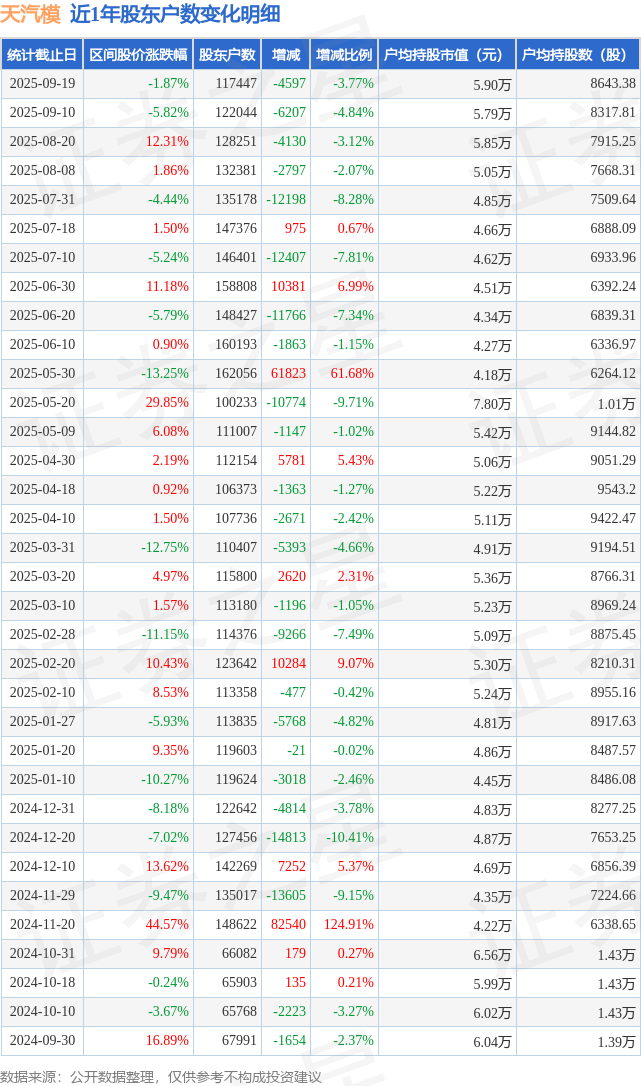 从股价来看,2025年9月10日至2025年9月19日,天汽模区间跌幅为1.87%,在此期间股东户数减少4597.0户,减幅为3.77%。