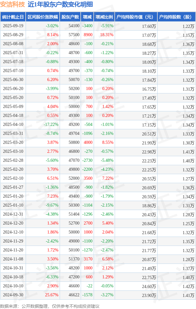 从股价来看,2025年8月29日至2025年9月19日,安洁科技区间跌幅为3.02%,在此期间股东户数减少3400.0户,减幅为5.91%。