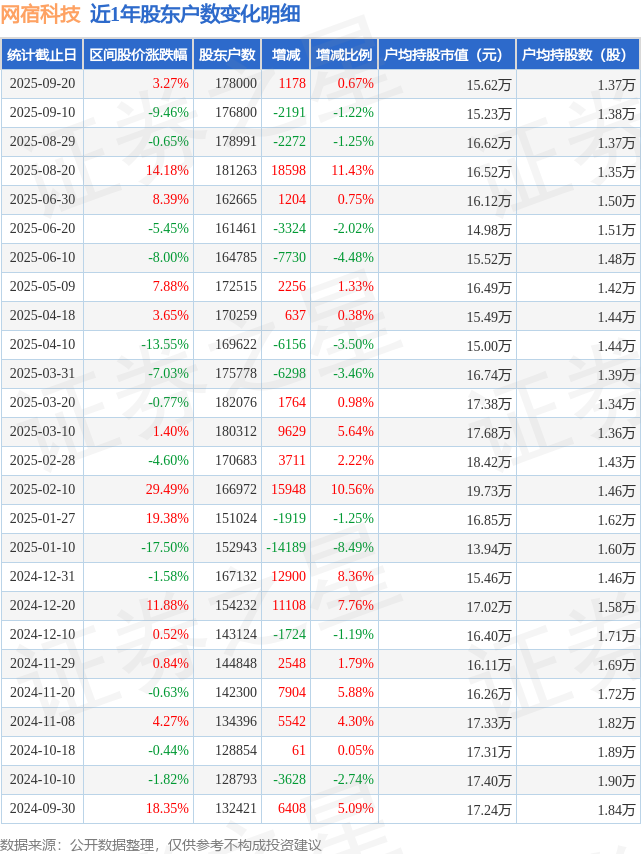 从股价来看,2025年9月10日至2025年9月20日,网宿科技区间涨幅为3.27%,在此期间股东户数增加1178.0户,增幅为0.67%。